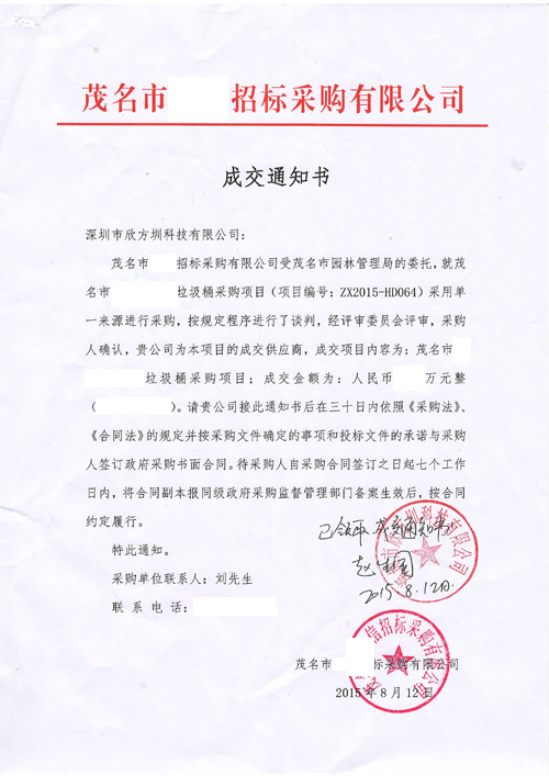 欣方圳擁有專業的5到10人的招標小部門工程,負責收集全國各地市政單位的招標信息。完整的招標流程,從咨詢,報名,核算成本,派遣核心部門業務人員參與競價投標。茂名市的競標招標,可謂是一波三折,驚心動魄。得知茂名有競價投標,仿大理石垃圾桶需求500個左右,金額達到幾十萬。欣方圳派遣了兩名業務人員,一名是業務經理,一名是業務員。開著欣方圳公司的公用車輛,火速趕往茂名投標。參與惡性價格競爭投標,業務人員核算成本不馬虎,必須得精確到位。事先準備打印出來的一頁,一頁的標書,疊在一起,用特制膠水把它整理整一本書籍。書籍完整后還得,一頁,一頁的紙上蓋上欣方圳公司的公章,方能生效。來來回回上百個頁面,蓋個章蓋得我手都麻木了哈!驅車來到茂名時,到了傍晚。暫行住宿一晚,迎接明天的好運。興致勃勃的業務員,在大廳苦等了兩個鐘,告知今天的投標取消。原因只有一個,本來是有四家公司報名,到場的只有兩家,不符合招標程序,故此取消!招標的評審團委員會,按照公平,公正,合理等程序進行。招標內容要從編號,材質,工期,價格,等幾大方面經評審團委員會進行綜合評審,才能知曉。無奈的業務部同事,只有等待推遲的日期再來。半個月后,欣方圳的業務部同事再次驅車趕往茂名競價投標。本次的投標有N家公司競投,業務部同事亞歷山大,帶著公司領導的期望出行,信心滿滿。垃圾桶競價投標,惡性競爭特大,都是在比拼價格,材質,做工等綜合。當天,競標的人員都拼齊到場,競標程序開始。在場的人員,都把各自的資料,樣板,都要呈現在各位評審團委員會前擺放,等待他們的評估結論。時間一分一秒的過去,業務部同事人員的心撲通,撲通的跳個不停。花落誰家,鹿死誰手,不得知曉!皇天不負有心人,一分耕耘,一分收獲,戰報在欣方圳公司里面的QQ群傳來捷報。此次中標者,深圳市欣方圳科技有限公司,經過陪審團的評估,價格,材質,做工等多方面得出結論勝出?。?!