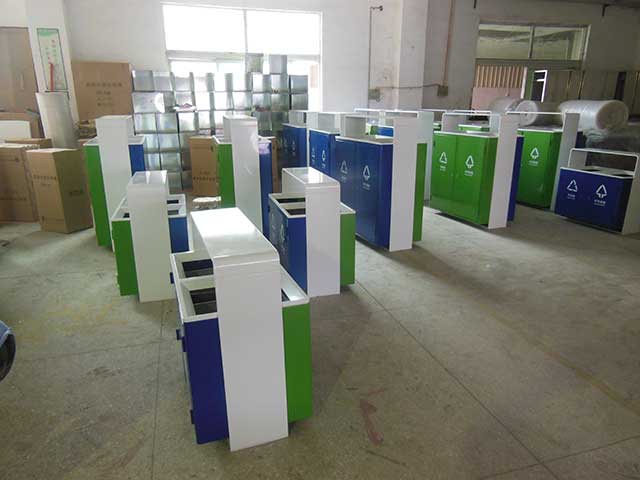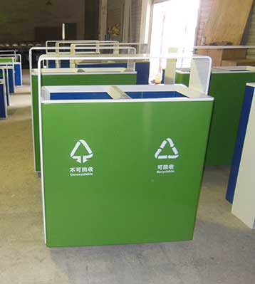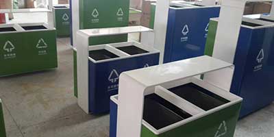 欣方圳鋼制戶外分類垃圾桶均選用優(yōu)質(zhì)的冷軋鋼板經(jīng)噴砂處理去油去銹后,鋼板表面抗紫外線丙稀酸油漆多層噴涂,