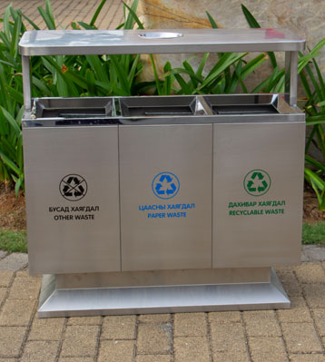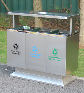 • 產品材質:不銹鋼戶外三分類果皮箱采用201#,202#,304#優質不銹鋼材料模壓成型,堅固耐用,不易破損;耐火安全,抗高低溫,適合各種惡劣氣候條件;金屬亮澤 ,高雅美觀,廣泛適用于各種場所;內外表面光潔,減少垃圾殘留,易于清潔;配置鍍鋅板內桶,便于垃圾清倒;