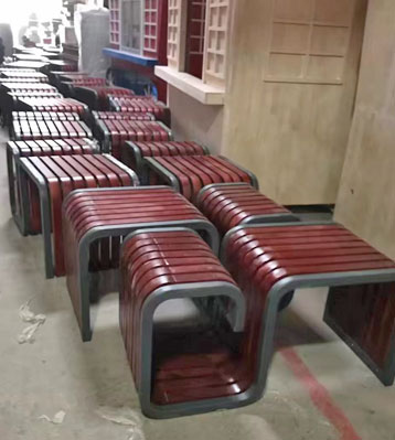 戶外藝術造型鋼制環保休閑椅椅面原材料采用真空泵排除空氣、填充防腐液、加壓滲透、抽真空排出多余防腐液達到先進的防腐防蟲工藝。