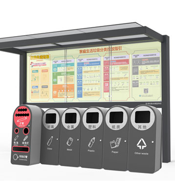 設有擋雨棚,可配備垃圾箱信息顯示屏、防水照明燈、廣告屏,進行地面硬化。對社區玻金塑紙可回收物,其他垃圾,廚余垃圾,有害垃圾等生活垃圾定時定點投放收集.