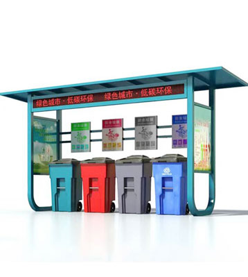 設(shè)有擋雨棚,可配備垃圾箱信息顯示屏、防水照明燈、廣告屏,進(jìn)行地面硬化。對(duì)社區(qū)玻金塑紙可回收物,其他垃圾,廚余垃圾,有害垃圾等生活垃圾定時(shí)定點(diǎn)投放收集.